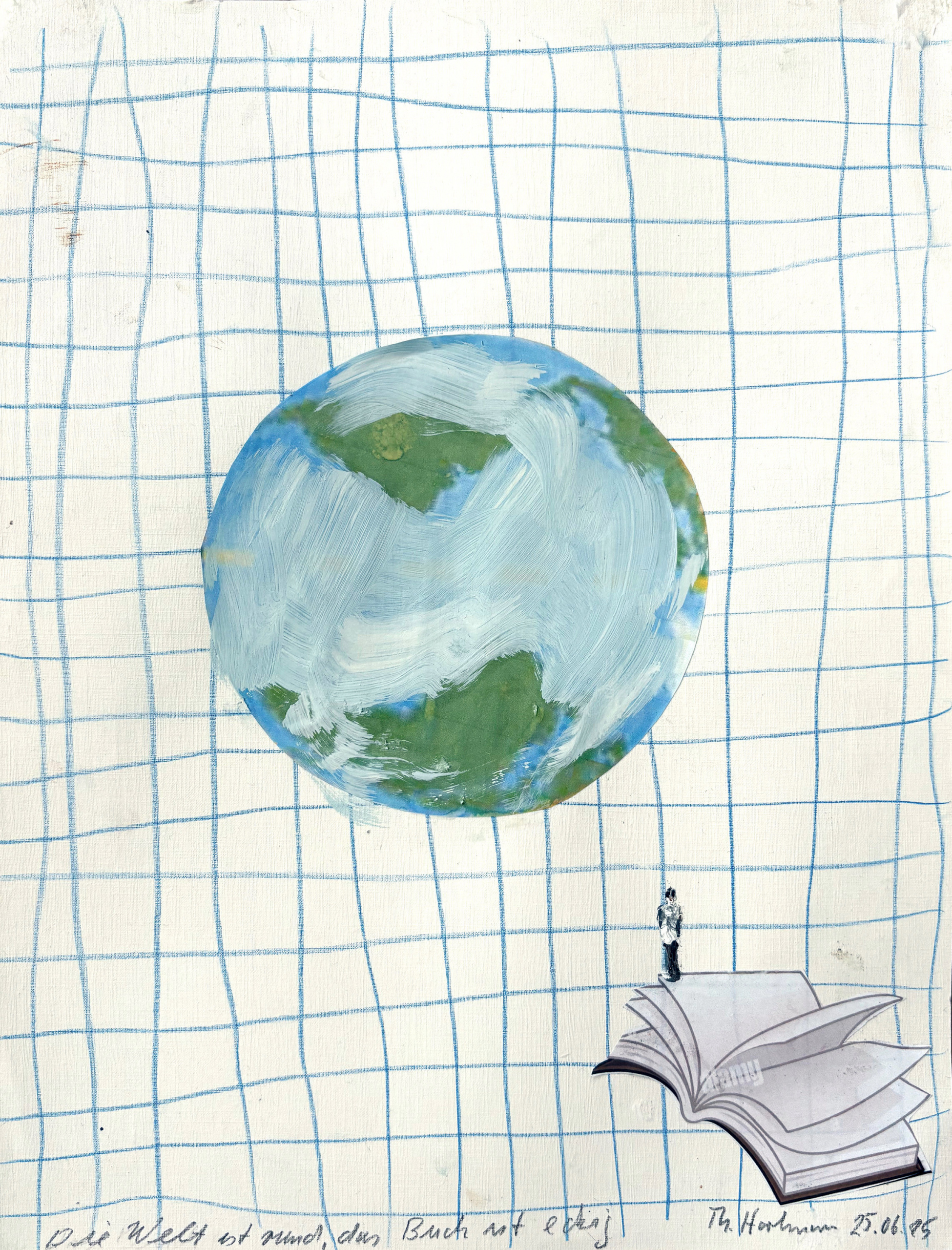 Die Welt ist rund, das Buch ist eckig 2025 40 x 30 cm Mischtechnik auf Papier mixed technique on paper